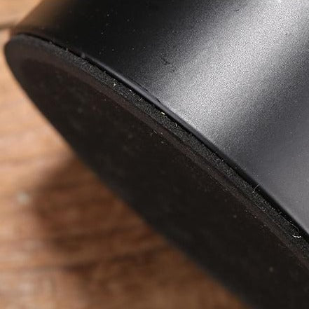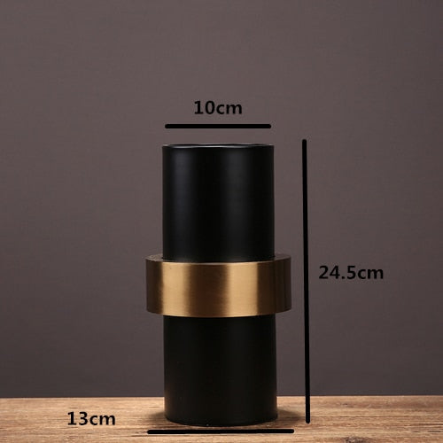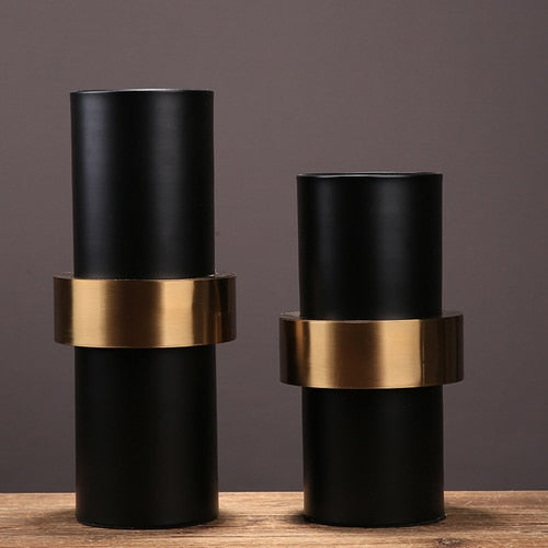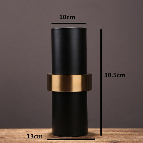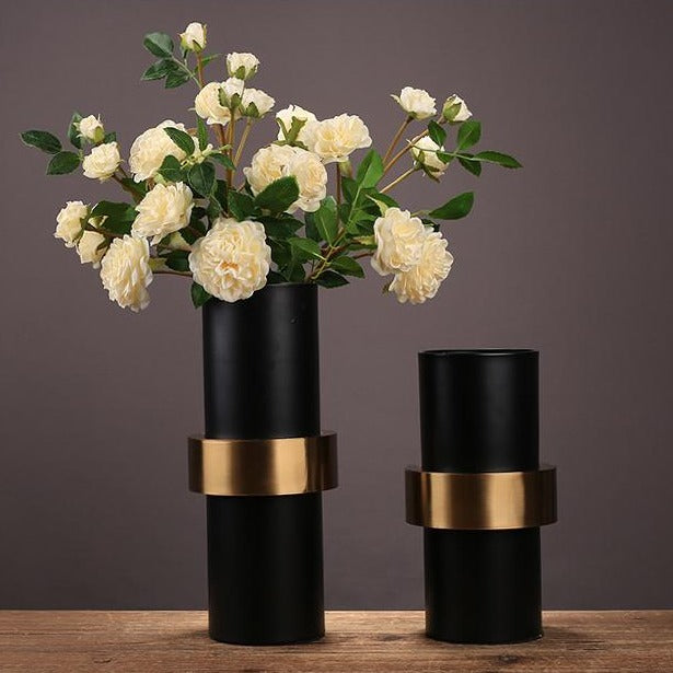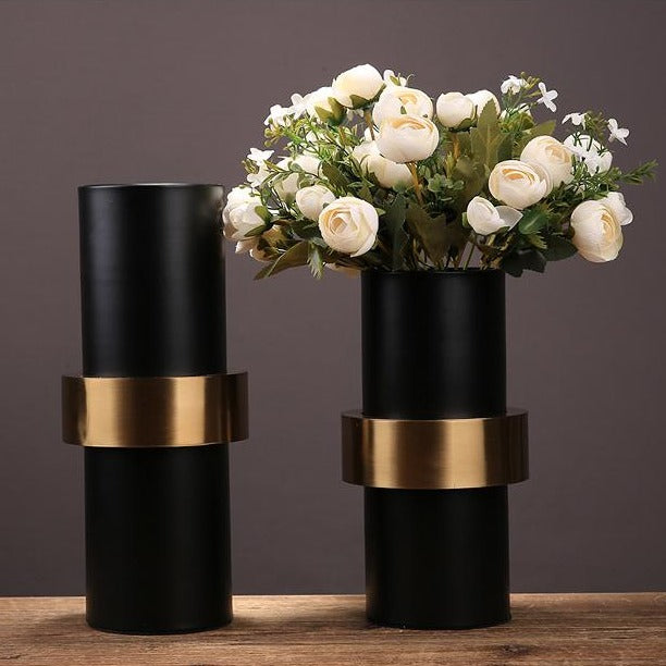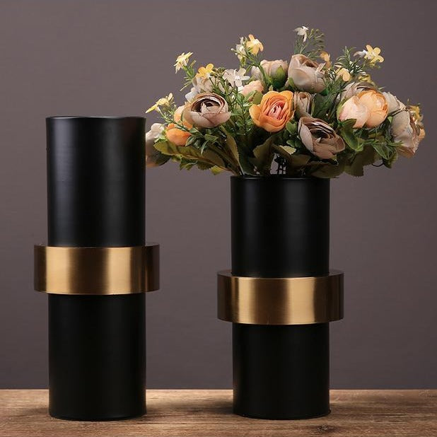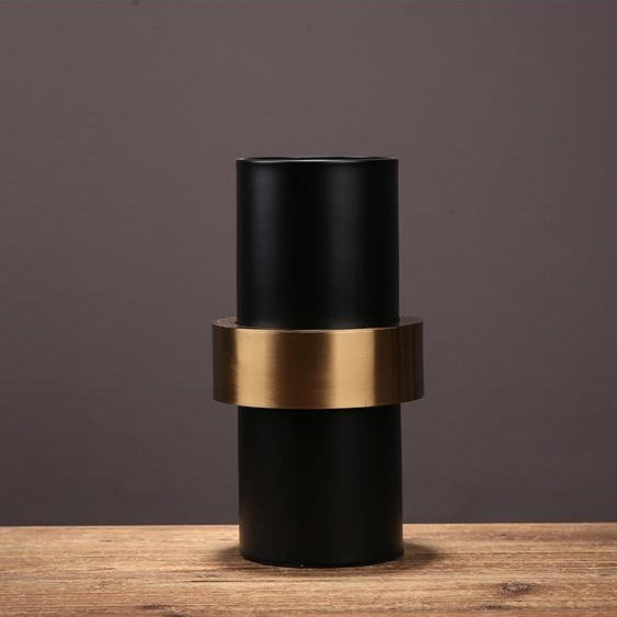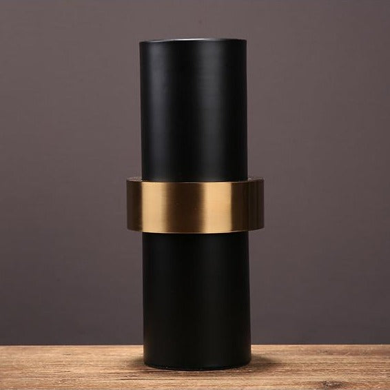 El carácter oscuro de este jarrón negro se magnifica por la presencia de una hebilla de metal dorado.