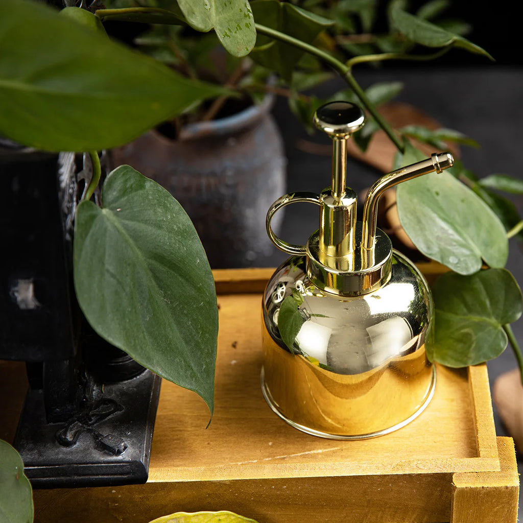 El contraste entre el oro brillante y el verde intenso de tus plantas crea una atmósfera chic y luminosa, digna de las revistas de decoración más bonitas.